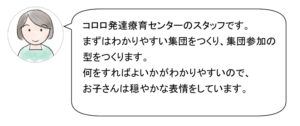 集団参加させたいお子さんの両隣は、静かな子に座ってもらい、良いモデルとなってもらいます。