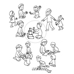 これらの遊びをするときには、はじめに、すでにその遊びの経験があり、やり方を知っているお子さんにモデルを示してもらいます。