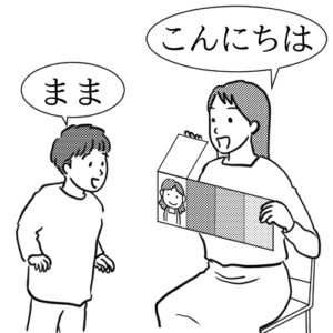 こうして提示されたタイミングで「音」を出すことができるようになったA君はお母さんを指さして「まま」と言う、